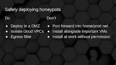 The SecKC crowd had questions about the safety of deploying honeypots. For the most part, the ones I discuss above are unlikely to lead to full shell access, but you can't be too sure. I had one attacker running tons of curl/wget commands from a Kippo honeypot last year, fetching ads, and essentially using my honeypot as a click fraud drone. Here was my advice from the presentation at SecKC: